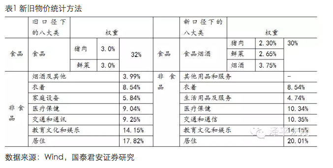 食品和非食品。新口徑食品類權(quán)重占比約20%,食品煙酒的權(quán)重占比30%,非食品類權(quán)重占比約70%。根據(jù)1月CPI同比增長1.8%,食品類價格同比增長4.1%,非食品類價格同比增長1.2%,可估算出食品類權(quán)重明顯降低,食品類權(quán)重從原來的33%降至20%,非食品類權(quán)重從原來的67%升至80%。