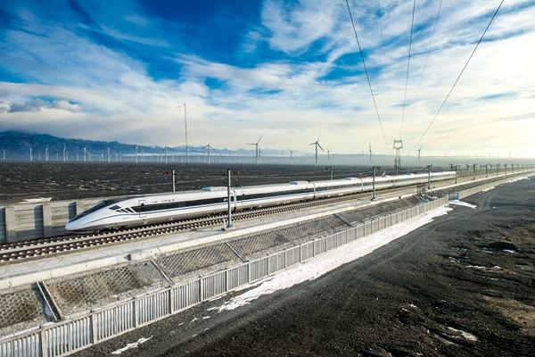 圖為中車四方股份公司研制的CRH2G耐高寒抗風沙動車組運行在蘭新高鐵