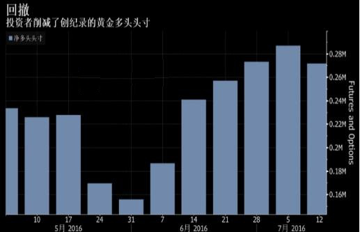 而在截至7月12日的一周里,黃金期貨和期權(quán)凈多頭頭寸減少了5.4%,至271529份合約。此前一周曾達(dá)到286921份合約,創(chuàng)下2006年有數(shù)據(jù)以來的最高水平。