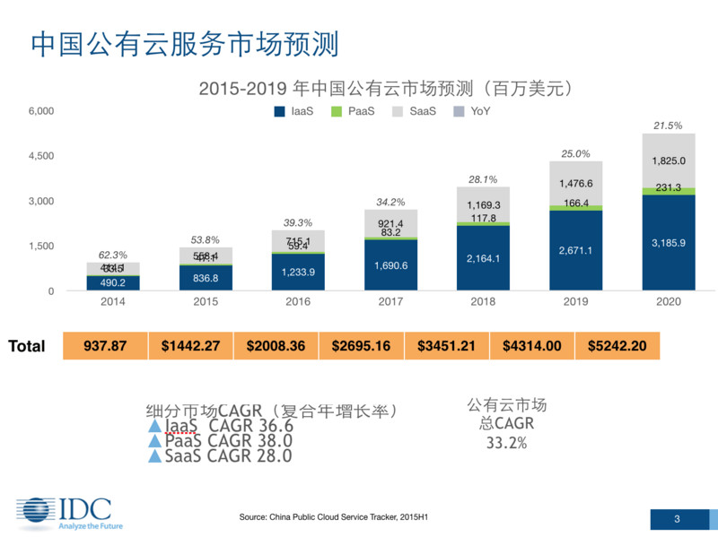 IDC還預(yù)測,2020年之前企業(yè)對IaaS的需求依然強烈,復(fù)合年增長率達到36.6%,PaaS平臺的復(fù)合年增長率為38%,SaaS為28%,整個公有云市場以每年32.2%的速度增長,2020年規(guī)模將超過50億美元。