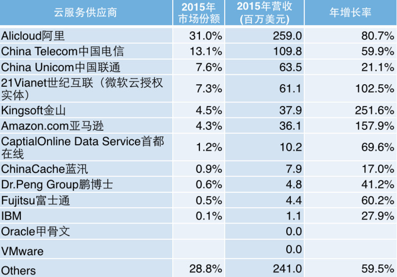 值得一提的是,亞馬遜作為外來者,IaaS市場的增長速度和占有率也頗為驚人,2015全年增速達到了157.9%,4.3%的市場份額緊隨金山云,排在了第六位。