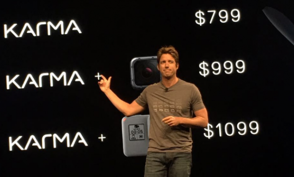 盡管GoPro Hero 5是主角,但對(duì)于消費(fèi)者來(lái)說(shuō),可能真正激動(dòng)人心的時(shí)刻是GoPro公司CEO?Nick Woodman從背上的背包里取出Karma無(wú)人機(jī)的那一瞬間。