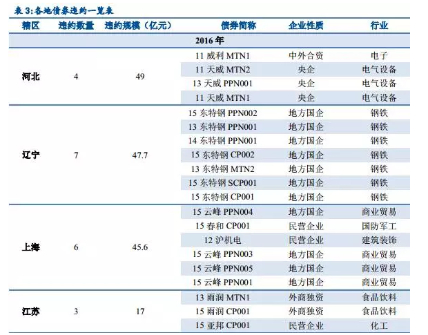 債券一直被視為安全的投資標(biāo)的,收益相對(duì)穩(wěn)定,不承擔(dān)經(jīng)營風(fēng)險(xiǎn),且可按期收回本金,確實(shí)在2014 年之前,中國債券市場沒有發(fā)生過發(fā)行主體實(shí)質(zhì)性違約,但其后,在經(jīng)濟(jì)下行和企業(yè)經(jīng)營不善的雙重壓力下,中國債券違約事件屢屢發(fā)生,風(fēng)險(xiǎn)暴露。2014年共發(fā)生6起,其中2起在浙江,上海、江蘇、福建和天津各1起,全部為民企和外企。2015年增加到18起,江蘇、四川、河北、山東和北京成為高發(fā)地,且出現(xiàn)了國企的身影。2016年,債券違約增至47起,涉及的區(qū)域和規(guī)模均在擴(kuò)大,遼寧多達(dá)7起,國企違約事件更加普遍。因此,在進(jìn)行投資時(shí),必須高度警惕,嚴(yán)控風(fēng)險(xiǎn)。