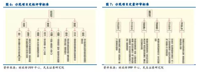 財(cái)政部示范項(xiàng)目由各省財(cái)政部門推薦,財(cái)政部組織專家評(píng)審選出的,項(xiàng)目質(zhì)量最有保障,操作最為規(guī)范。示范項(xiàng)目的評(píng)審標(biāo)準(zhǔn)十分嚴(yán)格,分為定性評(píng)審和定量評(píng)審兩部分:定性評(píng)審主要審查項(xiàng)目的合規(guī)性,包括主體合規(guī)、客體合規(guī)、程序合規(guī)三部分;定量評(píng)審是通過設(shè)定指標(biāo)和權(quán)重綜合評(píng)估項(xiàng)目的示范性。具體的評(píng)審細(xì)則如圖所示: