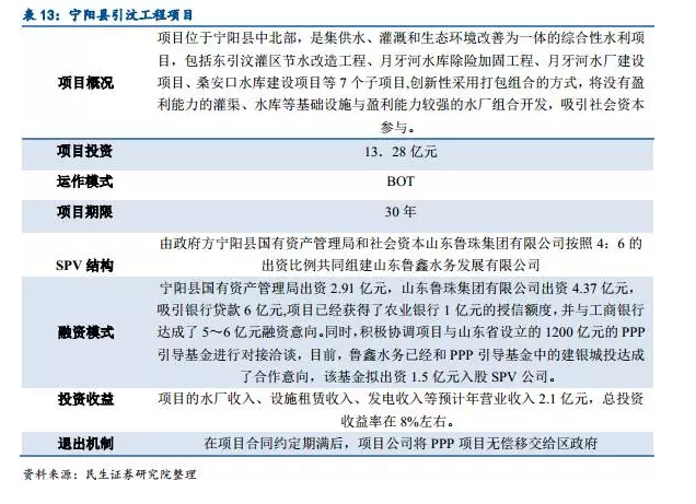 2015年5月,發(fā)改委、財(cái)政部、水利部等三部門印發(fā)《國家層面聯(lián)系的社會(huì)資本參與重大水利工程建設(shè)運(yùn)營第一批試點(diǎn)工作方案》,篩選出12個(gè)試點(diǎn)項(xiàng)目,確加快推進(jìn)項(xiàng)目前期工作、加大項(xiàng)目投資支持力度、創(chuàng)新項(xiàng)目產(chǎn)品定價(jià)機(jī)制等試點(diǎn)支持政策,推進(jìn)PPP模式在水利工程中的應(yīng)用。
