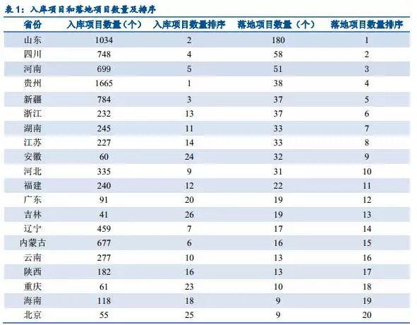 從表1可以看出,入庫項(xiàng)目數(shù)量和落地項(xiàng)目數(shù)量高度契合,入庫項(xiàng)目數(shù)量前五名分別為貴州、山東、新疆、四川和河南,其對(duì)應(yīng)的落地項(xiàng)目數(shù)量也位居前列。