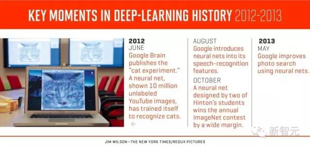 深度學(xué)習(xí)歷史關(guān)鍵點(diǎn):2012年谷歌大腦識別貓臉(6月),8月谷歌將神經(jīng)網(wǎng)絡(luò)引入語音識別,10月Hinton的學(xué)生在ImageNet競賽奪冠,成績大幅提升;2013年5月谷歌用神經(jīng)網(wǎng)絡(luò)改善照片搜索功能。