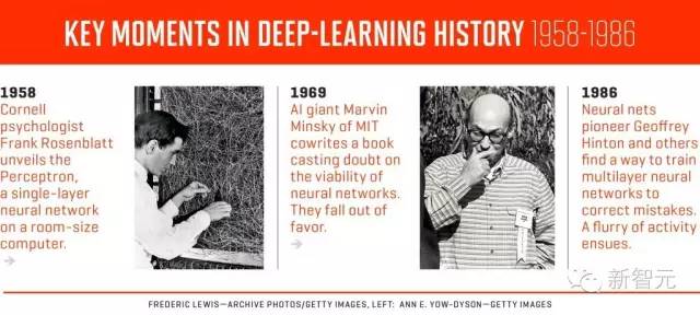 深度學(xué)習(xí)歷史關(guān)鍵點(diǎn):1958年康奈爾心理學(xué)家羅森布拉特推出感知機(jī),1969年明斯基出書質(zhì)疑神經(jīng)網(wǎng)絡(luò),1986年Hinton等人發(fā)明訓(xùn)練多重神經(jīng)網(wǎng)絡(luò)糾錯(cuò)的方法。