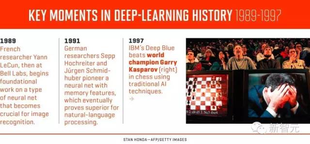 深度學(xué)習(xí)歷史關(guān)鍵點(diǎn):1989年LeCun用卷積神經(jīng)網(wǎng)絡(luò)識別手寫體,1991年遞歸神經(jīng)網(wǎng)絡(luò)發(fā)明,1987年IBM深藍(lán)戰(zhàn)勝卡斯帕羅夫。