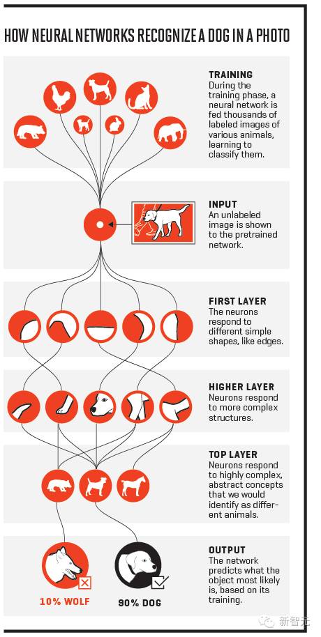 下一層,可能會發(fā)現(xiàn)更多復(fù)雜的配置,比如,一個(gè)圓圈中排列的許多個(gè)角”,這一層中的神經(jīng)元可能會對鳥的頭部作出反應(yīng)。在一個(gè)更深的層,一個(gè)神經(jīng)元可能會探測到頭部圓圈中反復(fù)出現(xiàn)的嘴部輪廓?!斑@構(gòu)成了一個(gè)很好的線索,可以判斷出這可能是鳥的頭部”,Hinton說。每一個(gè)更深層次的神經(jīng)元都會對更加復(fù)雜和抽象的概念作出反應(yīng),直至最后有一層對我們概念中的“鳥”作出匹配反應(yīng)。