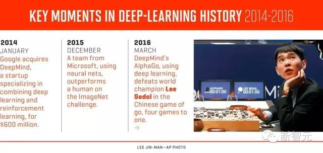 深度學(xué)習(xí)歷史關(guān)鍵點(diǎn):2014年谷歌收購DeepMind;2015年12月微軟ResNet圖像識別準(zhǔn)確率超越人類;2016年3月AlphaGo戰(zhàn)勝李世石。