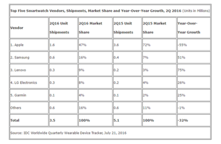 據(jù)IDC數(shù)據(jù),第二季度,全球智能手表出貨量為350萬塊,較去年同期的510萬塊下降了32%,為有史以來的首次同比下降,而蘋果是智能手表出貨量下滑的主要原因。