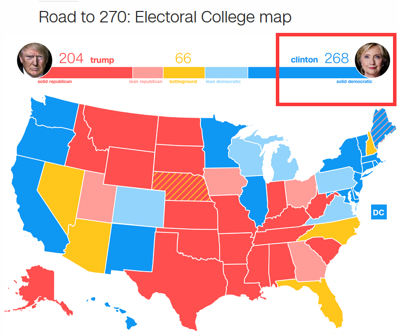 CNN最新選情預(yù)測(cè):希拉里的“穩(wěn)贏” 票數(shù)首次跌下270票大關(guān)!