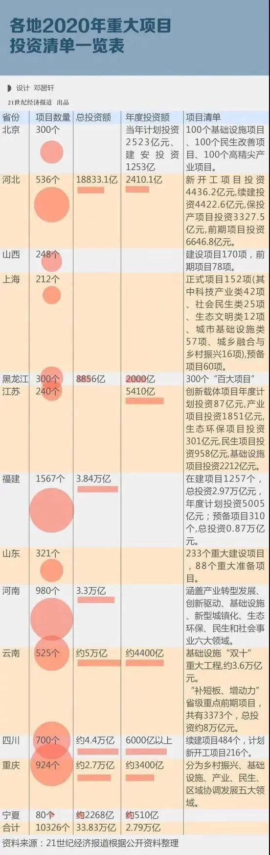值得一提的是,根據《21 世紀經濟報道》統(tǒng)計,截至 3 月 1 日,包括北京、上海、江蘇、福建、河南、重慶等在內的 13 個省市區(qū)發(fā)布了 2020 年重點項目投資計劃清單,包括 10326 個項目,其中 8 個省份公布了計劃總投資額,共計 33.83 萬億元——其中,基建投資是各地投資計劃中的重要組成部分,部分地區(qū)基建計劃投資額甚至占到了總投資額的一半以上。