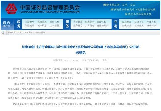 3月6日晚間,證監(jiān)會(huì)發(fā)布了《轉(zhuǎn)板上市指導(dǎo)意見(征求意見稿)》(簡(jiǎn)稱“指導(dǎo)意見”),明確了新三板掛牌公司轉(zhuǎn)板到滬深交易所上市的制度安排,其中對(duì)轉(zhuǎn)入板塊的范圍、轉(zhuǎn)板上市條件、程序、保薦要求、股份限售等事項(xiàng)作出原則性規(guī)定。