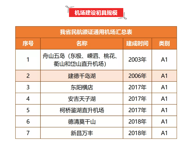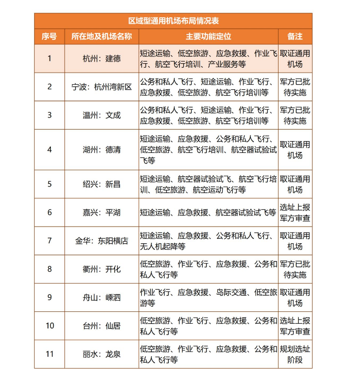 截至2019年底,浙江省已建7個民用運輸機場均已開展通用航空業(yè)務,新建的嘉興和麗水機場也已規(guī)劃通航區(qū)域。省內已有建德千島湖、東陽橫店等經(jīng)民航頒證A類通用機場11個,已經(jīng)軍方批準場址待實施通用機場7個,其他起降場地15個。