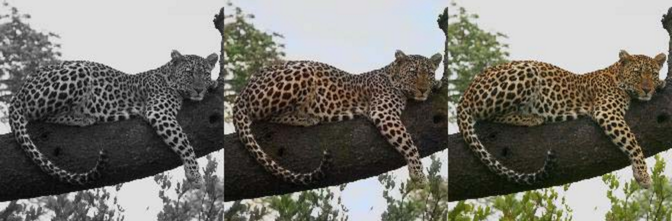 左邊:黑白照片;中間:自動(dòng)上色的照片;右邊:真實(shí)的顏色